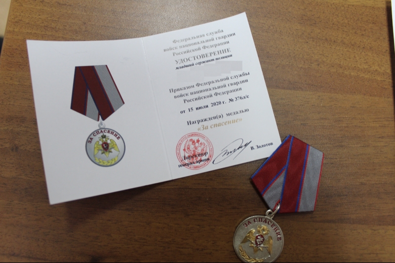 Награду получил боец Росгвардии, который не раздумывая бросился в воду, увидев тонущую женщину.