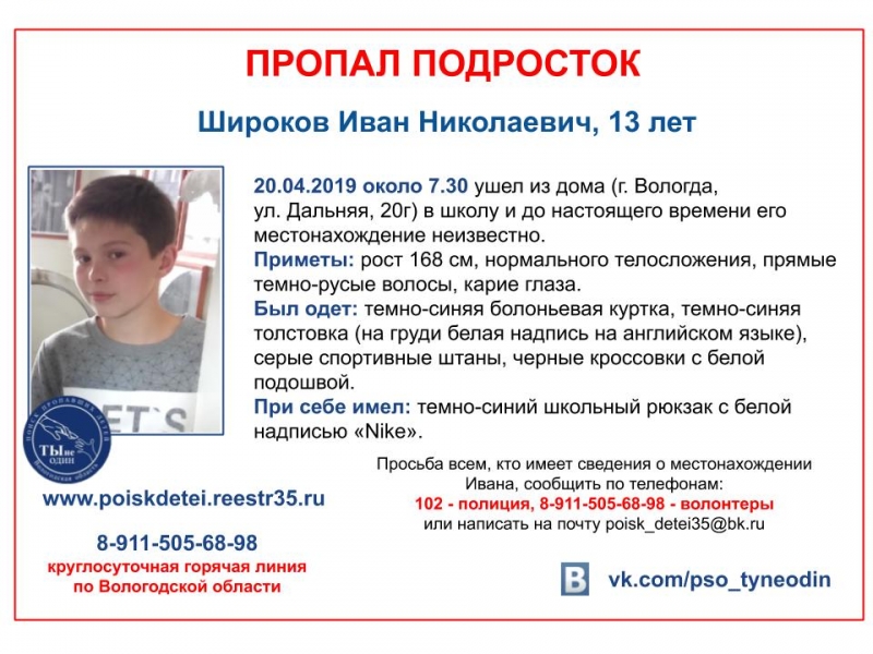 Пропавшего школьника ищут в Вологде волонтеры и полиция. Информация о «потеряшке» появилась в группе в соцсетях поисково-спасательного отряда «Ты не один»: по данным волонтеров, 13-летний Иван Широков вчера, 20 апреля, в половине восьмого утра отправился в школу из дома №20г на улице Дальней. Пользователи группы около двух часов назад написали, что подросток найден, но официально эти сведения в ПСО не подтвердили.
