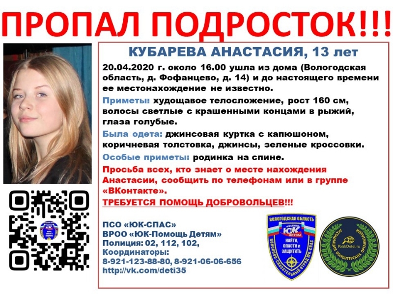 Анастасия Кубарева ушла из дома в поселке Фофанцево 20 апреля около 16 часов. Где сейчас находится подросток, неизвестно. К поискам подключились волонтеры ПСО "ЮК-Спас".