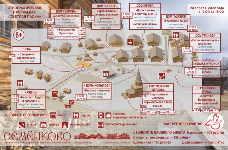 Как всегда подготовлена программа с погружением в будни деревни примерно начала XX века. Сотрудники музея выйдут в нарядных сарафанах, начищенных сапогах. Гостей Семенково ждут игры, пляски, высокие качели – обязательный атрибут Пасхи. Также по желанию можно будет принять участие в сельском сходе, на уроке в школе, пройти с гармонистом по деревне.