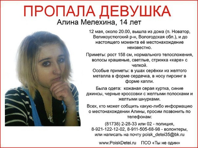 ищут в Вологодской области. 14-летняя Алина Мелехина ушла из дома в поселке Новатор Великоустюгского района вечером 12-го мая. С тех пор о ее
