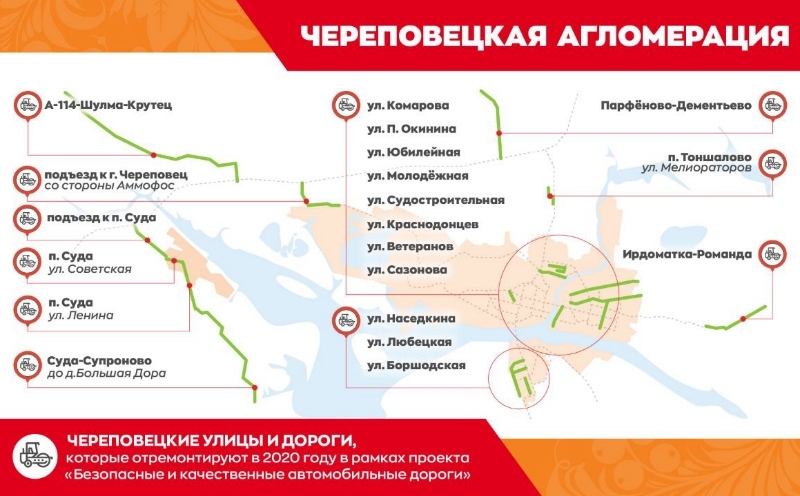 В числе других объектов Череповецкого района - "Воскресенское – Иванов Бор – Кириллов", "Череповец – Белозерск – Липин Бор", А-114-Шулма, подъезд к Череповцу (со стороны "Апатит").
