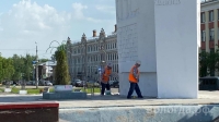 Проводятся восстановительные работы на монументе на площади Революции. Памятник, который в народе именуют «зуб» предстоит покрасить, отреставрировать постамент, цветочницы и ступени на центральном входе.