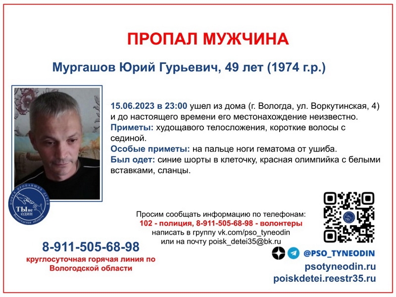 Мужчина проживает в Вологде на улице Воркутинской. Последний раз он выходил на связь 15 июня. С тех пор – тишина. Юрий худой, волосы короткие с проседью. Был одет в синие шорты, олимпийку, на ногах сланцы. Из особых примет: может хромать из-за гематомы на пальце.