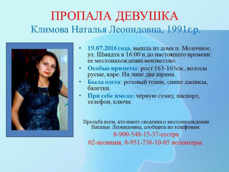 В посёлке Молочном пропала Наталья Климова. 19 июля 25-летняя девушка ушла из дома по улице Шмидта в 16:00, и до сих пор её местонахождение неизвестно.
