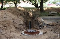 Сейчас работы идут во дворе на Победы, 210. У дома лужа начала подтапливать фундамент. Специалисты поставили новый люк, и воде будет куда уходить.