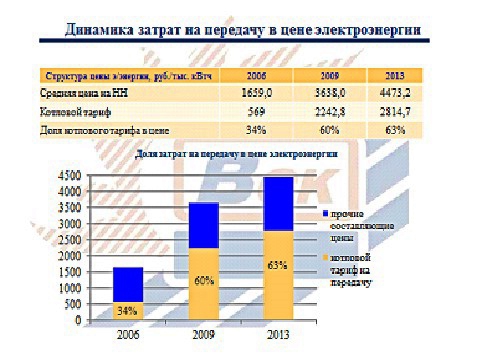 В Вологодской области котловой тариф на передачу в цене электроэнергии в 2013 году составляет 63%. Для сравнения в 2006 году доля тарифа на передачу составляла 34% от конечной цены электроэнергии*.
