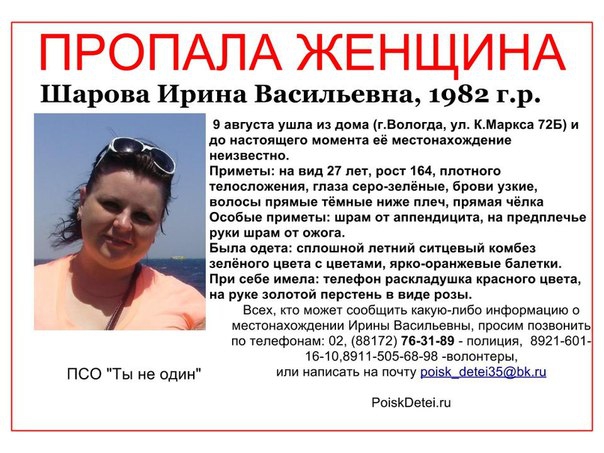 Пропавшую женщину ищут в Вологде. Ирина Шарова ушла из дома почти 2 недели назад — 9 августа. Вологжанка вышла из здания на улице Карла Маркса, 72Б и пропала.