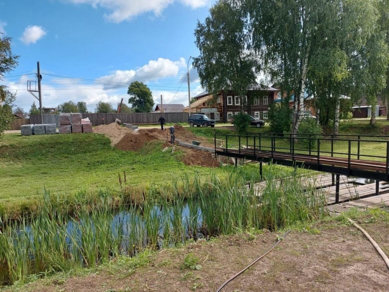 Сейчас завершается строительство мостика и укладка тротуарной брусчатки, продолжается установка резных беседок. По словам главы Великоустюгского района Александра Кузьмина, уже скоро устюжане и гости города смогут прогуляться по обновленному скверу.
