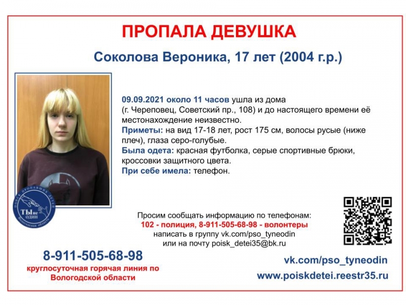 17-летняя Вероника Соколова ушла из дома утром 9 сентября. Подросток живет на Советском проспекте, 108. До сих пор неизвестно, где сейчас девушка. Информация о поиске юной череповчанки появилась в группе ПСО «Ты не один».