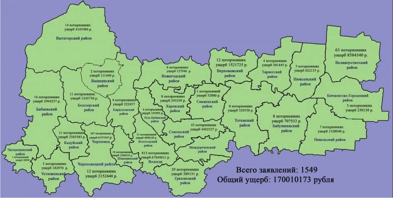 Всего сначала года в полицию поступило 813 заявлений от потерпевших жителей областного центра. Общий ущерб превысил 67 миллионов рублей, сообщает ИА «СеверИнформ» со ссылкой на пресс-службу УМВД России по Вологодской области.