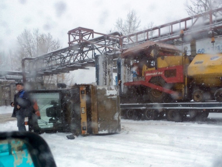 Каток перевозили на платформе-полуприцепе. На выезде с площадки на улице Промышленной, 2 каток съехал на проезжую часть и упал на бок.