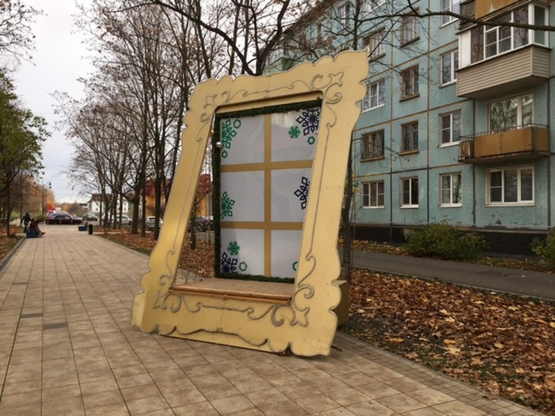 «Зеркало» - это украшение, которое при подключении к электричеству делает красивые снимки зимнего пейзажа с портретом человека. В прошлый год на аллее стоял светящейся шар. В этом, видимо, дислокацию арт-объектов решили поменять.
