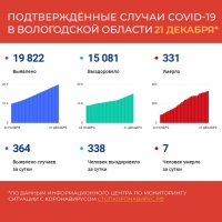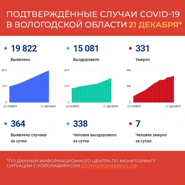 По данным официального портала стопкоронавирус.рф, за 20 декабря на Вологодчине этот диагноз украсил медкарты 364 жителей Вологодчины.