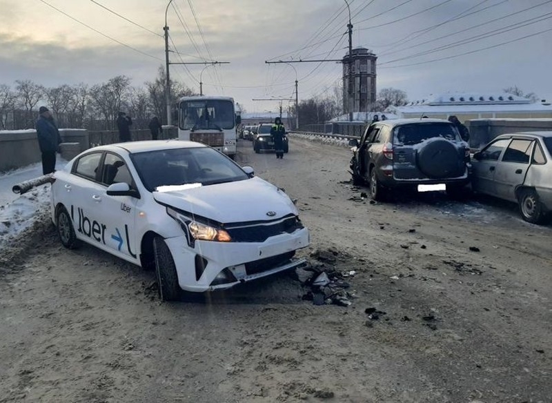 33-летний таксист на Киа переезжал мост в сторону Заречья, не учел скорость и въехал в «четырнадцатую», идущую впереди. При столкновении Киа отбросило в сторону. В это время по встречной полосе шла Тойота под управлением 47-летнего мужчины. Тут уже занесло Тойоту. Машина врезалась в Дэу, за рулем которой сидел водитель 47 лет, рассказали в областном УГИБДД. В результате завала травмы получила пассажирка такси. 72-летнюю женщину увезли на скорой в больницу, сообщает ИА «СеверИнформ».