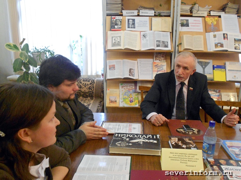По окончанию встречи Игорь Степанов подарил библиотеке книгу «Венценосная семья» о династии Романовых. В ответ Председателю Вологодской городской Думы вручили благодарность «За многолетнее и плодотворное сотрудничество и действенную поддержку проектов библиотеки, направленных на развитие культурного потенциала молодых читателей».