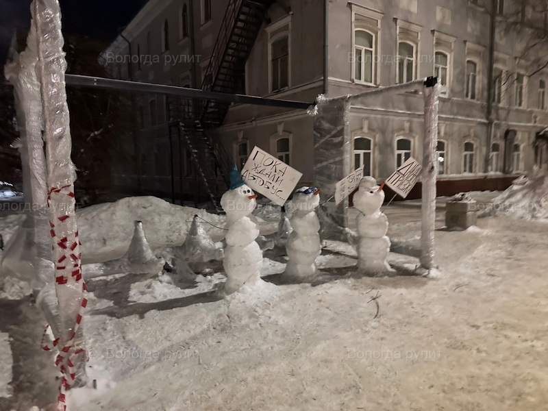 Три снеговика слеплены на остановке рядом с Детским музыкальным театром на Советском проспекте. У них в руках плакаты: «Пока ждали автобус», «Добавьте автобус на маршрут». Именно по проспекту проходит автобус №1, на который очень много нареканий по поводу несоответствия графика и недостатка машин. Партийцы надеются, что проблема транспорта будет решена хотя бы в этом году. Ведь в Вологду пришла новая партия автобусов.