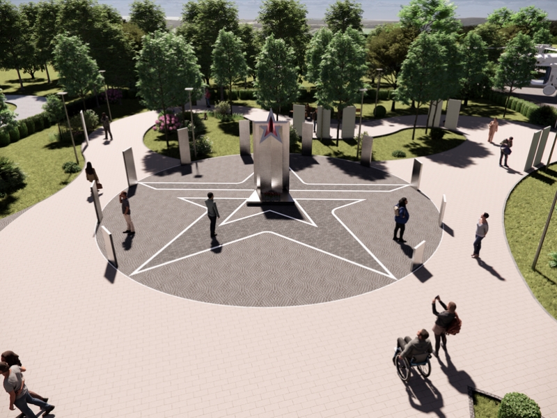 По проекту на входе посетителей будет встречать скульптура бойца, а по обе стороны входной группы разместятся флагштоки с российскими флагами. Главным символом памяти станет монумент, посвященный подвигу героев СВО. Он будет располагаться в центре сквера. Внутри монумента предусмотрена звезда с красной подсветкой, символизирующая Победу, силу и подвиг. Также в качестве одного из решений предлагается создание тропы памяти в виде изогнутой мощеной дороги, вдоль которой расставлены информационные стенды, рассказывающие об истории СВО. Справа от входной группы расположат зону лектория. Это будет открытое пространство, предназначенное для проведения образовательных мероприятий, лекций, дискуссий. Здесь установят сидения и экран.
