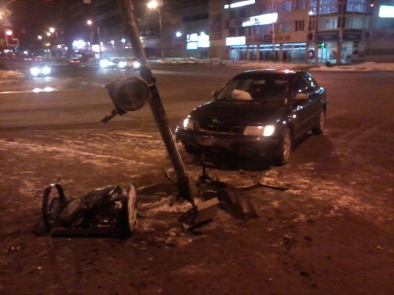 Не справившись с управлением собственным автомобилем «Volkswagen Passat», мужчина въехал в светофорный столб. На место аварии приехали сотрудники ГИБДД и пожарная машина.