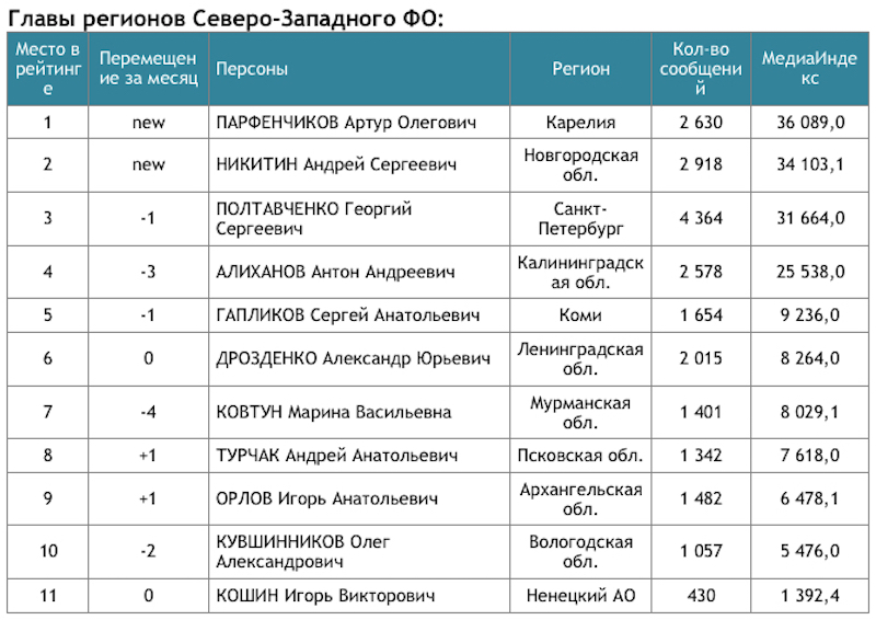 Однако, надо отметить, что первые 2 места в февральском рейтинге достались вновь назначенным врио Главы Карелии Артуру Парфенчикову и врио губернатора Новгородской области Андрею Никитину. Данные назначения способствовали повышенному вниманию СМИ к лидерам медиарейтинга.