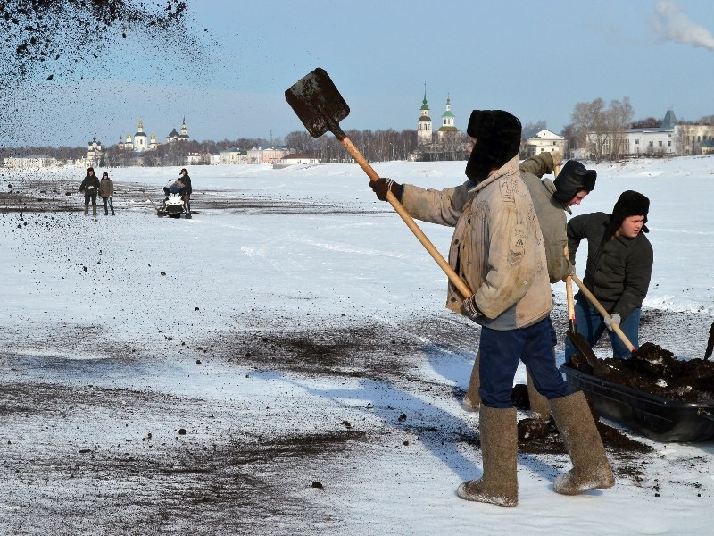 Администрация района организовала помощь курсантов Великоустюгского речного училища на реках Сухона и Юг во время чернения льда золой.