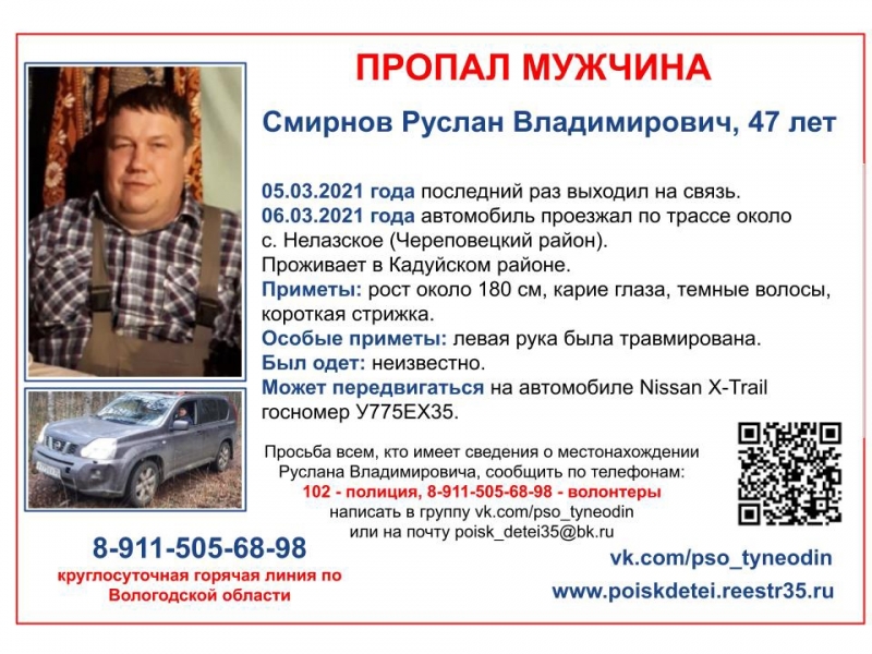В последний раз 47-летний Руслан Смирнов выходил на связь 5 марта. На следующий день его машину видели проезжающей по трассе около села Нелазское Череповецкого района. ПСО "Ты не один" опубликовал информацию о поиске.