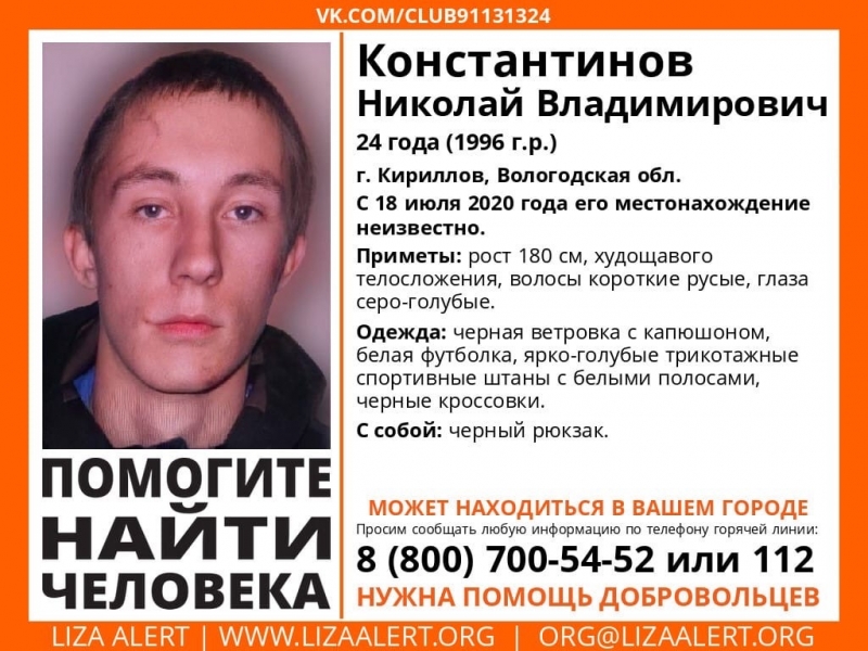 Хотя он может находиться и в других регионах. О местонахождении 24-летнего Николая Константинова неизвестно с 18 июля прошлого года. О поисках жителя Кириллова пишет ПСО "Лиза Алерт".