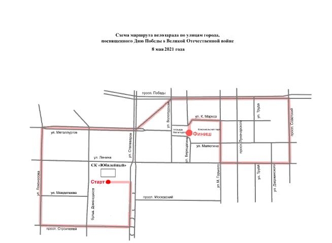 Участники проедут по Сталеваров, проспекту Строителей, Ломоносова, Металлургов, Бардина, проспекту Победы, Вологодской, Советскому проспекту, Ленина, Горького, Карла Маркса, Верещагина. Финишная точка - площадь Металлургов. Там в полдень пройдет флешмоб "Победа" и фотографирование.