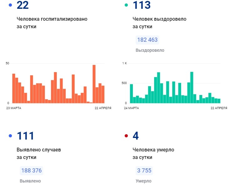 Уже поправились 182 тысяч пациентов, включая 113 человек за сутки. На больничные койки попали 22 заболевших. Таковы данные на утро 22 апреля.