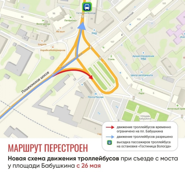 С 24 мая московский подрядчик ООО «ЦМПТ» начнет подготовительные работы реконструкции. В первую очередь будет ограждена территория проведения работ. С 26 мая будет изменена схема движения троллейбуса по маршруту «Бригантина – Областная детская больница». Так как на площади запланирован демонтаж контактной сети, то троллейбус не будет ходить до остановки «Вокзал». При спуске с Пошехонского моста он пойдет до остановки «Гостиница Вологда», минуя «петлю» через вокзал, и поедет далее по маршруту.