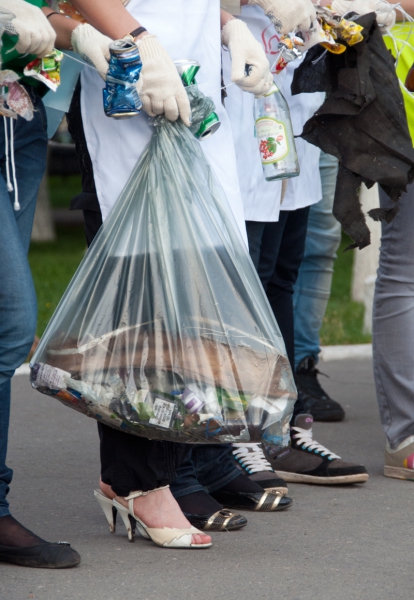 Участники соорудили гирлянду из собранных бумажек, банок и прочих отходов и отправились к контейнерам их выкидывать