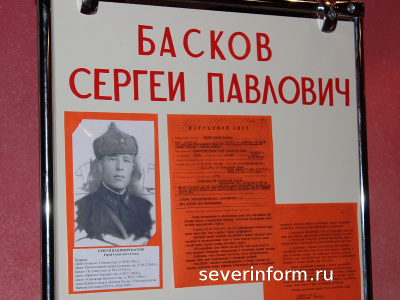 Герой Советского Союза Сергей Басков родился в Сталинграде в 1917 году, позже его семья переехала в Сокол, откуда он и был призван на фронт. На его счету множество наград, в том числе - медаль «Золотая Звезда» Героя Советского Союза, ордена Ленина, Красного знамени, орден Суворова III степени и орден Александра Невского. Однако поле войны имя героя было незаслуженно забыто, и сегодня его нет ни в одной книге памяти. Восстановить справедливость несколько лет назад решила его племянница Татьяна Алексеева. Собрав документы, она обратилась за помощью в Сокольский краеведческий музей, и поисками данных о Сергее Баскове занялась хранитель фондов музея Надежда Федорина. Теперь в музее создан отдельный стенд, на котором размещены снимки Сергея Баскова, которые удалось найти, и его наградной лист.