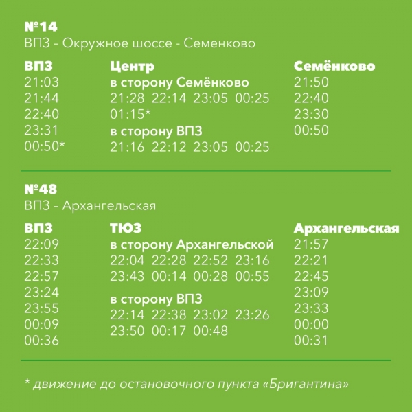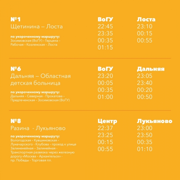 Чтобы вологжане могли спокойно добраться после праздника из центра города в свои микрорайоны, с 23.00 до часа ночи будут ходить автобусные маршруты №1, 6, 8, 48 и 14. Стоимость проезда будет такой же, как и в любой другой день, сообщает ИА «СеверИнформ».