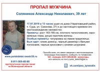 17 июля 39-летний Александр Соляников ушел из своего дома, расположенного на улице Сазонова в поселке Суда, и пропал. С тех пор ни семья мужчины, ни правоохранительные органы не могут установить его местонахождение.