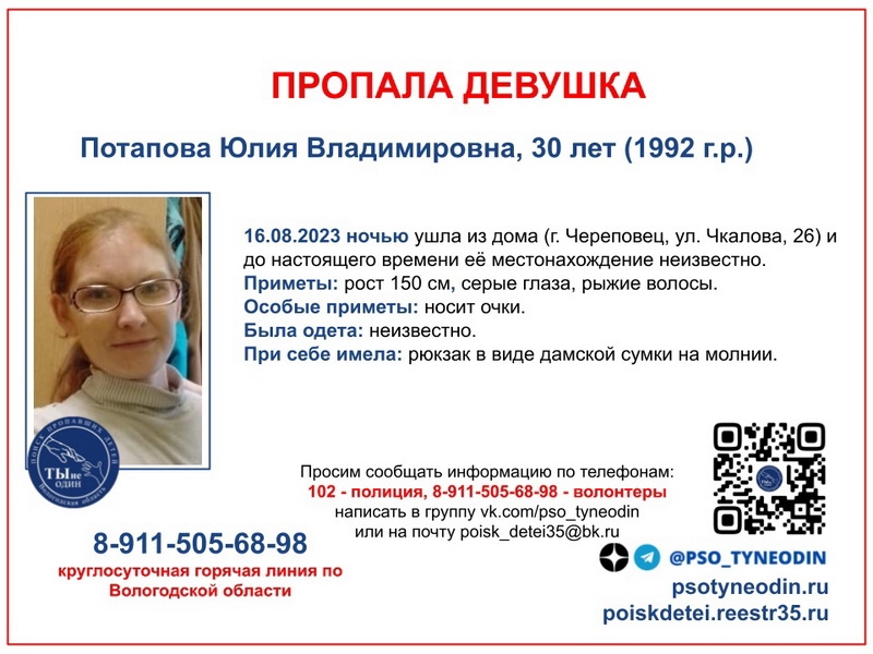 30-летняя череповчанка живет на улице Чкалова. Она ростом всего 150 см, у нее рыжие волосы и серые глаза. Девушка носит очки. В чем она вышла из дома, не известно, но точно при себе должна иметь небольшой рюкзачок в виде дамской сумки.