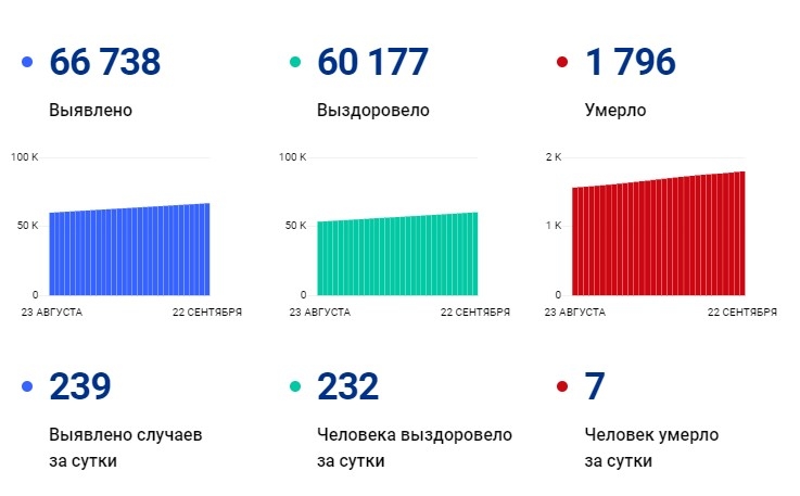 При этом в регионе остается 4765 активных случаев заболевания. За сутки диагноз подтвердился у 239 человек. Общее количество заболевших достигло 66738. Выздоровели 60177 пациентов, в том числе, 232 за последние сутки. Таковы официальные данные на утро 22 сентября.
