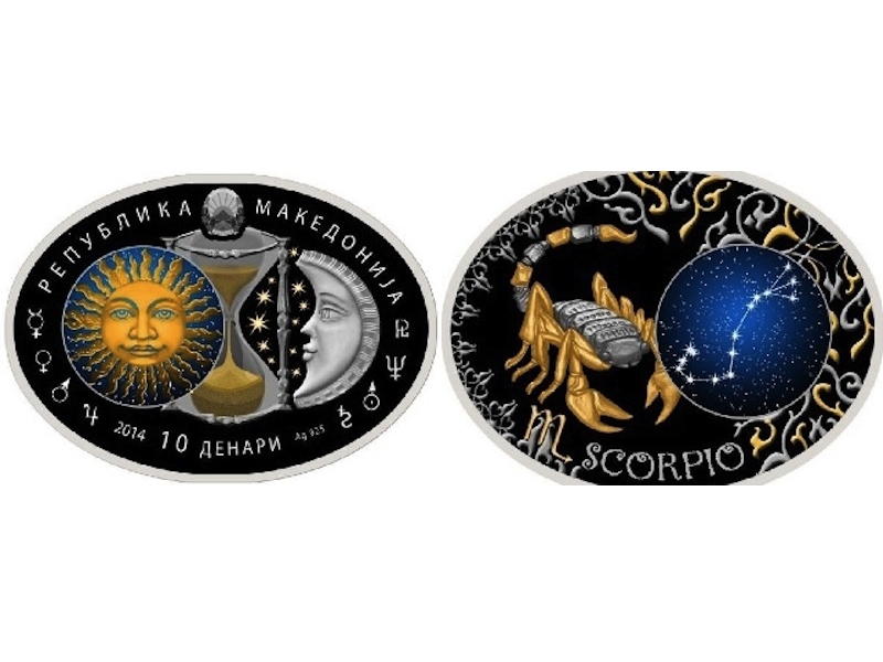 Монета «Скорпион» входит в серию «Знаки зодиака», которая выпускается по заказу Республики Македония с середины этого года. На аверсе монеты по центру изображены песочные часы, слева – цветное изображение солнца, справа – месяца со звездами. По контуру имеются 8 символов, обозначающих знаки зодиака.