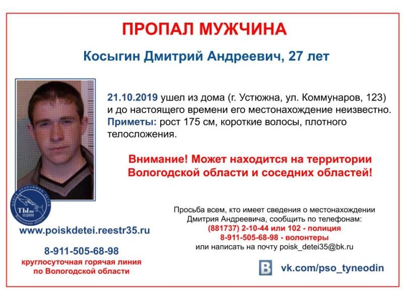 27-летний Дмитрий Косыгин вышел из своего дома на Коммунаров, 123 в городе Устюжне и пропал.
