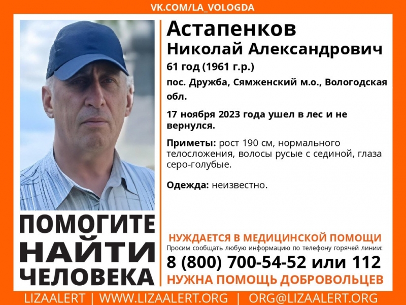 61-летний житель Сямженского округа, нуждающийся в медицинской помощи, потерялся 17 ноября. Пенсионер ушел из поселка Дружба и не вернулся.