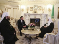 Вологде. О реформе Вологодской митрополии шла речь на встрече Святейшего с губернатором Олегом Кувшинниковым и митрополитом Вологодским и Кирилловским Игнатием. Патриарх встретил вологодских гостей в резиденции, расположенной в Даниловском монастыре Москвы, сообщает