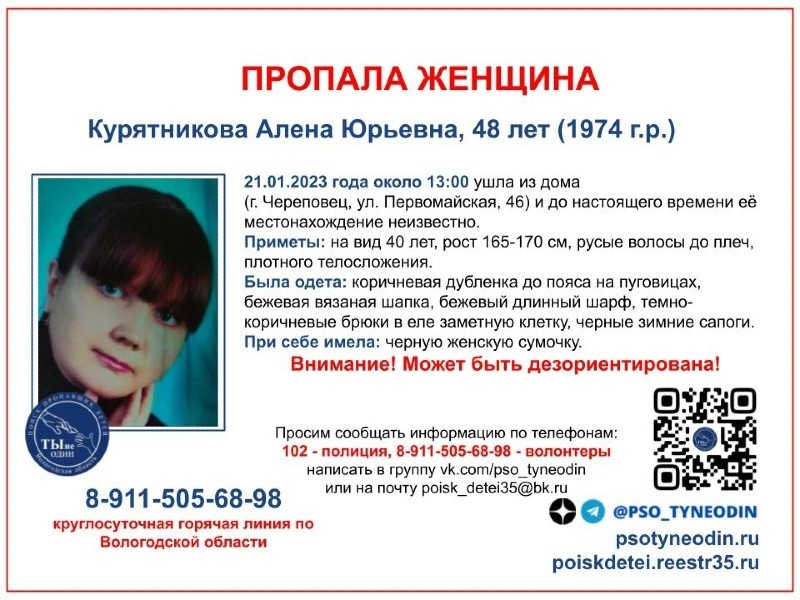 48-летняя женщина проживает по адресу Первомайская, 46 в Череповце. На вид ей лет 40, невысокая, русые волосы до плеч. Была одета в коричневую дубленку до пояса, вязаная шапка бежевого цвета, в тон ей шарф. При себе имела черную сумку. Женщина дезориентирована.