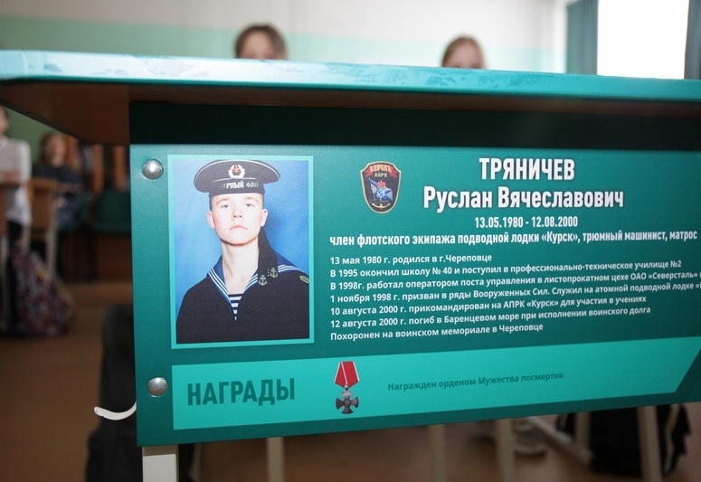 Парта героя появилась в кабинете №15 40-й школы. Здесь учился Руслан Тряничев. После окончании он окончил индустриальный колледж, работал на «Северстали», а в конце 1998 года ушел в армию и служил на атомной подлодке «Воронеж».