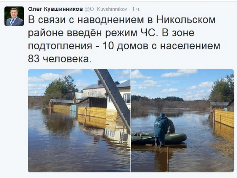 В связи с наводнением в Никольском районе ввели режим ЧС. Об этом в своем Твиттере сообщил губернатор Вологодской области Олег Кувшинников. В настоящее время в зоне подтопления находится 10 домов с населением 83 человека. Олег Кувшинников проведет сегодня ВКС с Никольским районом, сообщает ИА «СеверИнформ».
