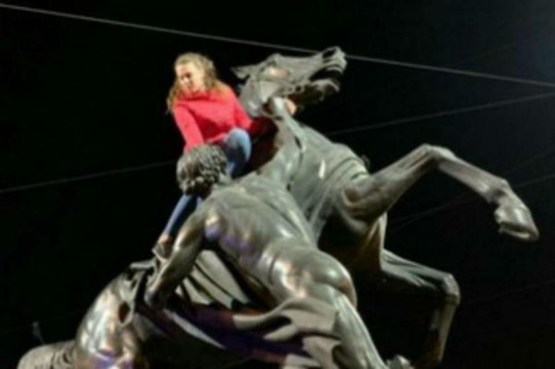 Девицы оседлали коней на Аничковом мосту в Санкт-Петербурге