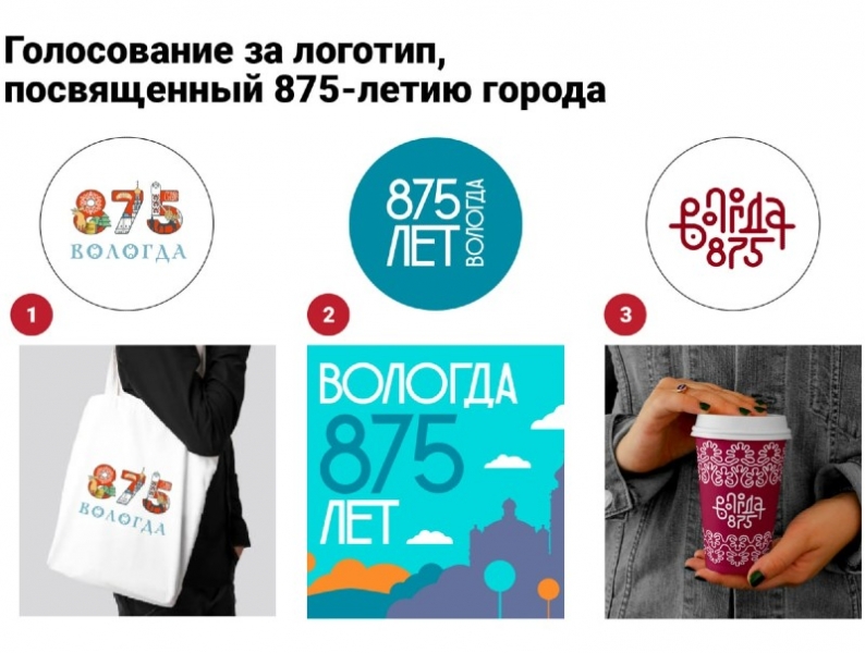 Вологде 875 лет. В связи с таким событием мэр города объявил конкурс на логотип праздника. Он будет размещен на всей сувенирной продукции, товарах местного производства. На конкурс поступило около 40 заявок. Из них выбраны три.