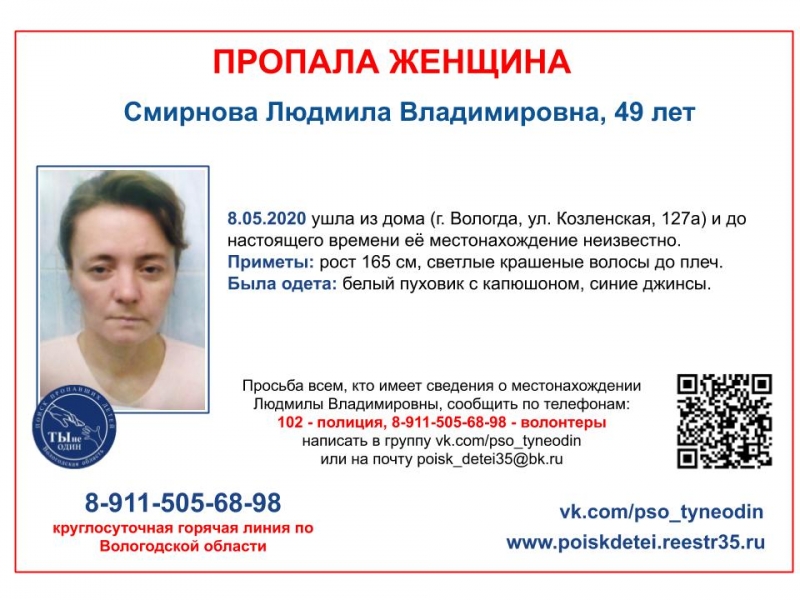 49-летняя Людмила Смирнова ушла из дома на Козленской, 127А. Это случилось еще 8 мая. Где сейчас женщина, неизвестно. В группе ПСО "Ты не один" появилась информация о поиске.