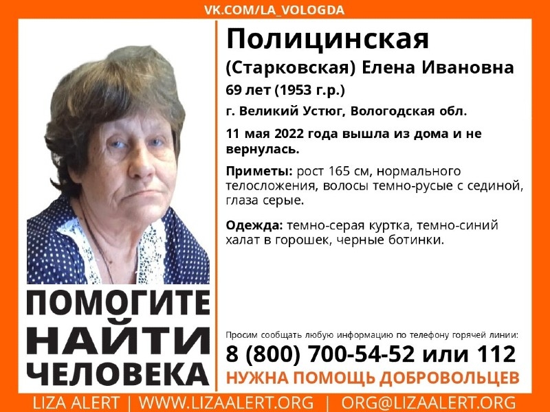 Елена Полицинская вышла из дома и не вернулась. Приметы: рост 165 см, обычного телосложения, темно-русые волосы с сединой, глаза серые. Вышла в чем была: халат в горошек, сверху накинута темно-серая куртка, на ногах черные ботинки.