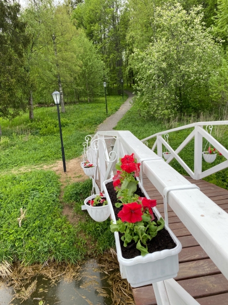 «Идея оформления арт-объектов живыми цветами в Старом парке появилась сразу же с появлением этих белых деревянных конструкций. Кашпо свисают на столбах, а цветочные ящики установлены на перильном элементе. Каждый из парковых объектов по-своему ожил, заиграл живыми красками, ухоженностью и каким-то особенным праздничным настроением. Вырастить рассаду цветов, высадить в кашпо и цветочные ящики все восприняли с энтузиазмом. Не было какой-то единой концепции, каждый для себя сам определял выбор вида растения и его цветовую гамму. В общем, кто с чем уже имел дело, тот с тем и работал», - рассказал смотритель усадьбы Спасское-Куркино Николай Сайкин.