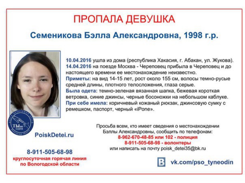 В Череповце пропала 17-летняя жительница Республики Хакасия Семеникова Бэлла Александровна. 10 апреля этого года она ушла из дома по улице Жукова в городе Абакане. 14 числа того же месяца на поезде "Москва - Череповец" прибыла в город металлургов, и до настоящего времени её местонахождение неизвестно.