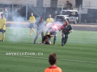 Один из болельщиков появился на поле после гола, забитого вологжанами в ворота соперников из Рыбинска. В руках у мужчины был файер. Его сразу же стали догонять охранники. Файер у хулигана отобрали, а его самого вывели с матча.